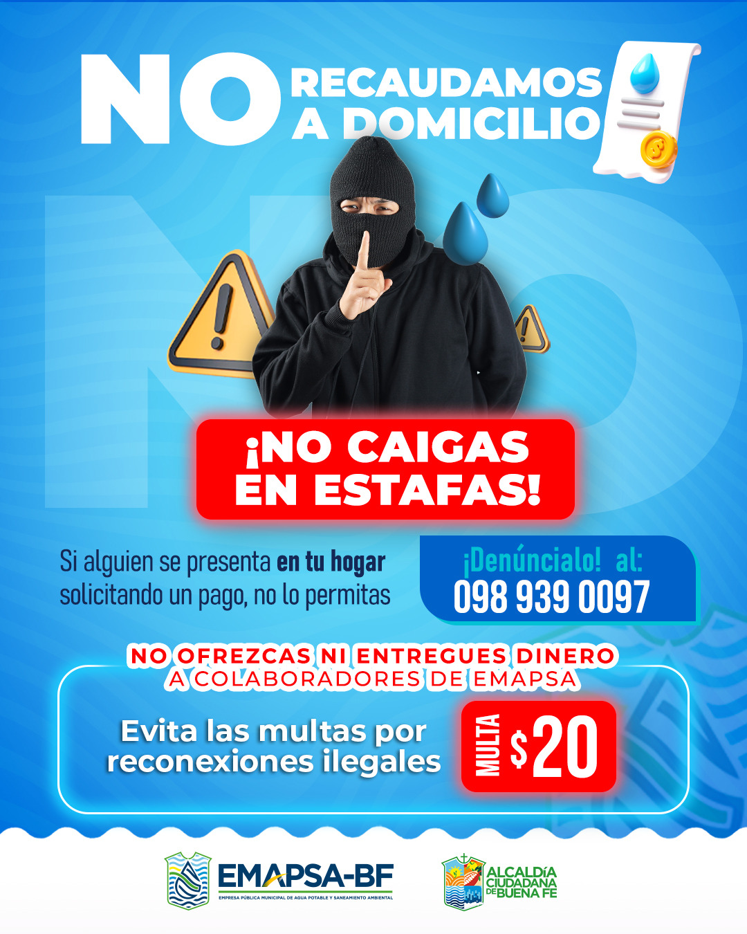 ¡Evita sanciones y estafas! No te reconectes ilegalmente No entregues dinero a colaboradores Recuerda que EMAPSA no realiza cobros a domicilio. Denuncia cualquier irregularidad al: 098 939 0097 ¡Cuida tu seguridad y evita multas!